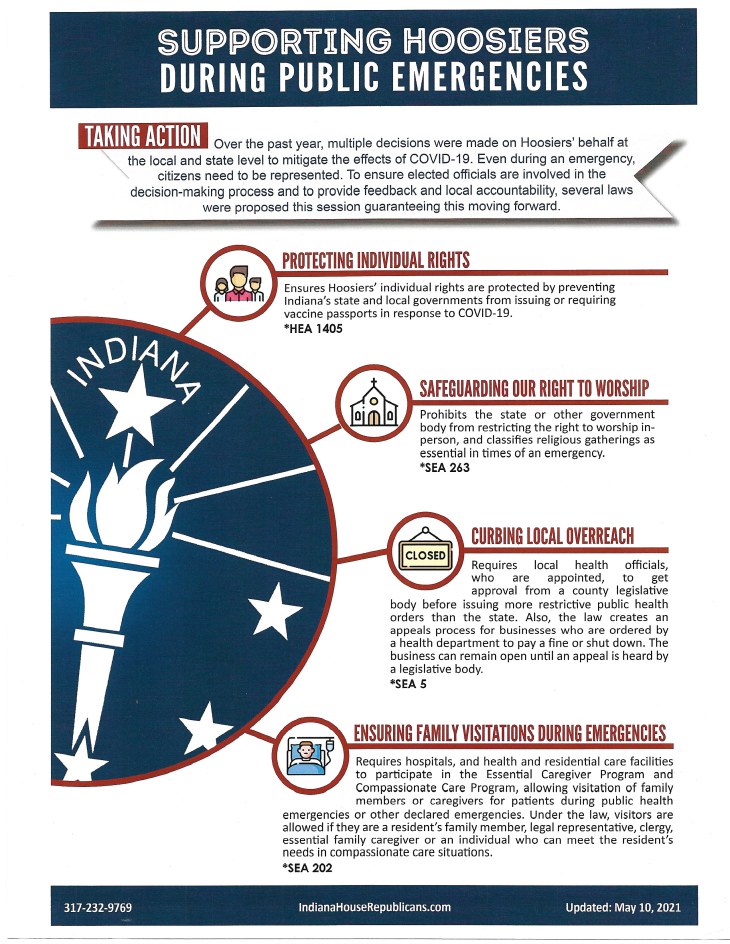 You spoke and we listened… over the past year, multiple decisions were made on Hoosier’s behalf at the local and stale level to mitigate the effects of COVID-19. Even during an emergency the citizens need to be represented. To ensure elected officials are involved in the decision-making process and to provide feedback and local accountability, several laws were proposed this session guaranteeing this moving forward.